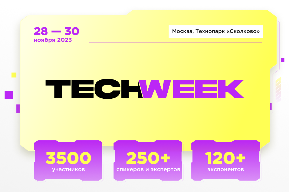 TECH WEEK состоится в Технопарке «Сколково» юбилейный десятый раз с 28 по 30 ноября. Тематическое ядро события – обмен опытом от основателей и топ-менеджеров, свежие кейсы построения эффективных бизнес-процессов, маркетинг и продажи, лидерство и инвестирование в условиях кризиса.
